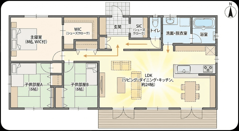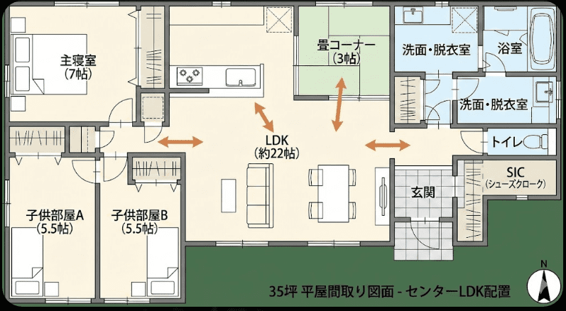 特に35坪という限られた面積の中でLDKを広く取りたい場合は、北玄関や東・西玄関にして、南面をリビングとダイニングで独占する配置が成功しやすい傾向にあります。