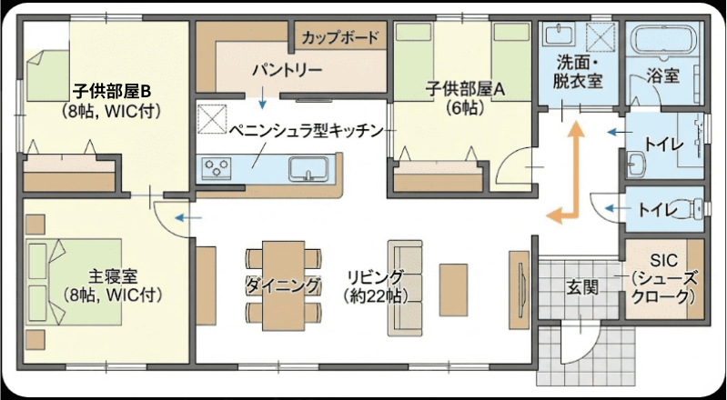 35坪あれば、こういった回遊動線を取り入れる余裕は十分にあります。