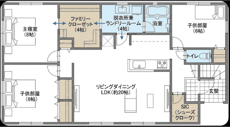 個室をコンパクト(4.5畳〜5畳程度)に抑えることで、35坪でもLDKを20畳近く確保したゆとりのある4LDKが作れます。