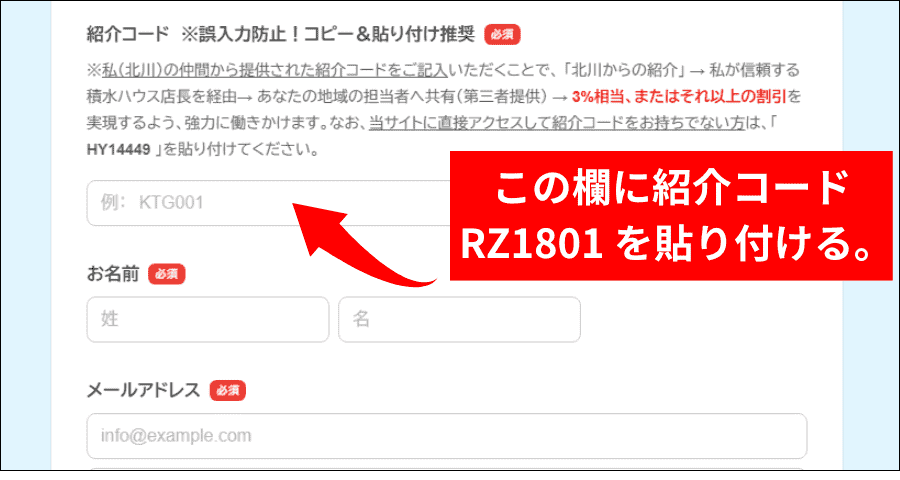 ここで紹介コード欄にコピーした紹介コード RZ1801 を貼り付けてください。