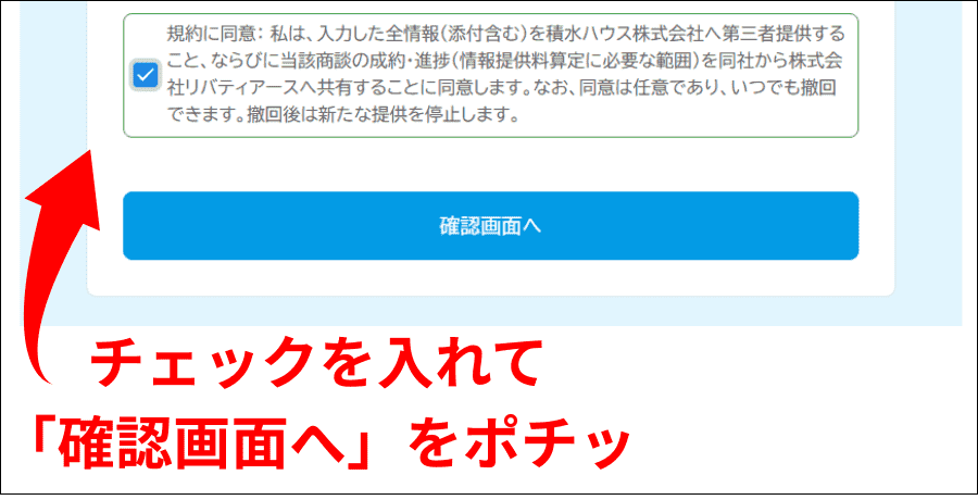 4、同意事項にチェックを入れて「確認画面へ」を押す。